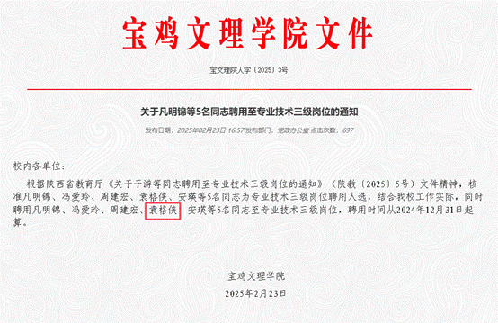 近日,从陕西省教育厅《关于于游等同志聘用至专业技术三级岗位的通知》(陕教〔2025〕5号)及《关于凡明锦等5名同志聘用至专业技术三级岗位的通知》(宝文理院人字〔2025〕3号)文件获悉,我集团袁格侠教授聘用至专业技术三级岗位。