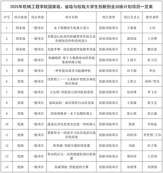 近日,教育部、省教育厅及学校正式公布了2025年大学生创新创业训练计划项目立项结果。我集团共有14个项目获得立项,其中国家级项目3项、省级项目6项、校级5项,涵盖机器人技术、石油智能装备、农业机械等多个前沿与特色领域,展现了我集团在跨学科创新与实践融合方面的持续突破。